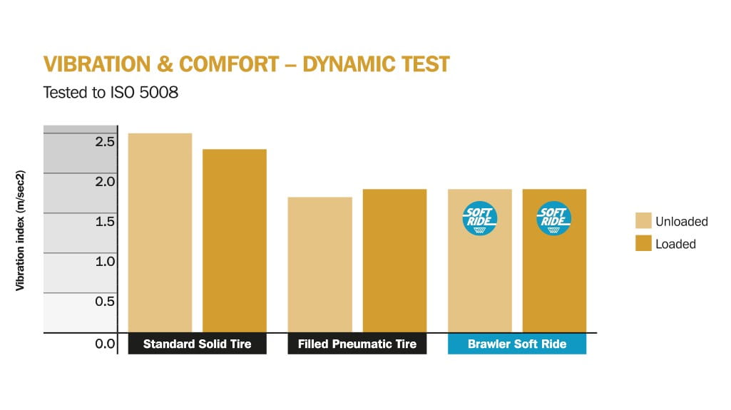 Brawler propose un mélange de gomme Soft Ride en combinaison avec les alvéoles ellitiques uniques dans le flanc du pneu pour une capacité d'absorption de choc bien supérieure réduisant sensiblement les vibrations et assurant la meilleure protection possible pour l'opérateur et la machine.